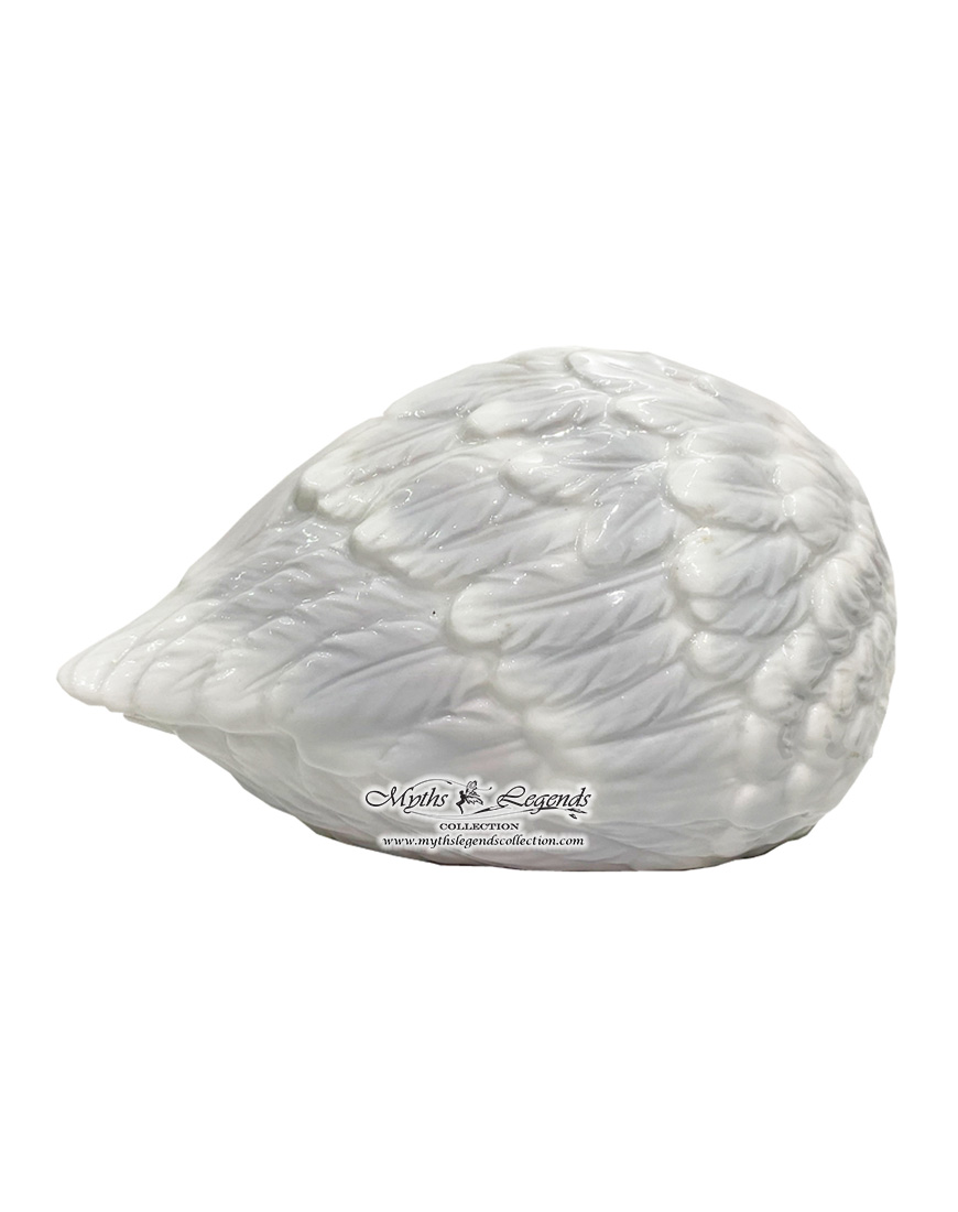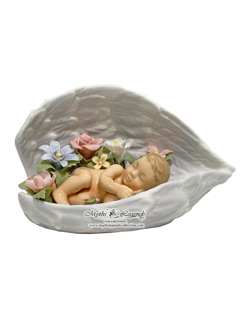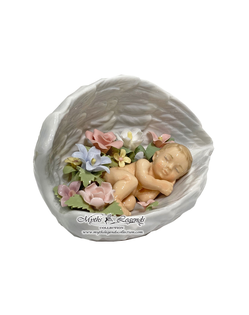 This is a finely detailed porcelain sculpture of a baby protected by a pair of angel wings signifying the blessings of an angel. The features of the baby are beautifully hand-painted, imparting a sense of relaxation to the viewer. The baby is nestled in a bed of delicate spring flowers that add colour and vibrancy to this heartwarming scene. This is a perfect gift for a baby shower or to celebrate a new addition to the family.