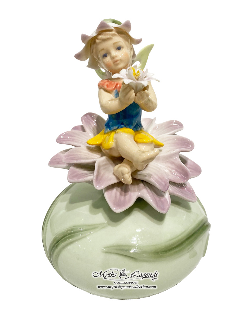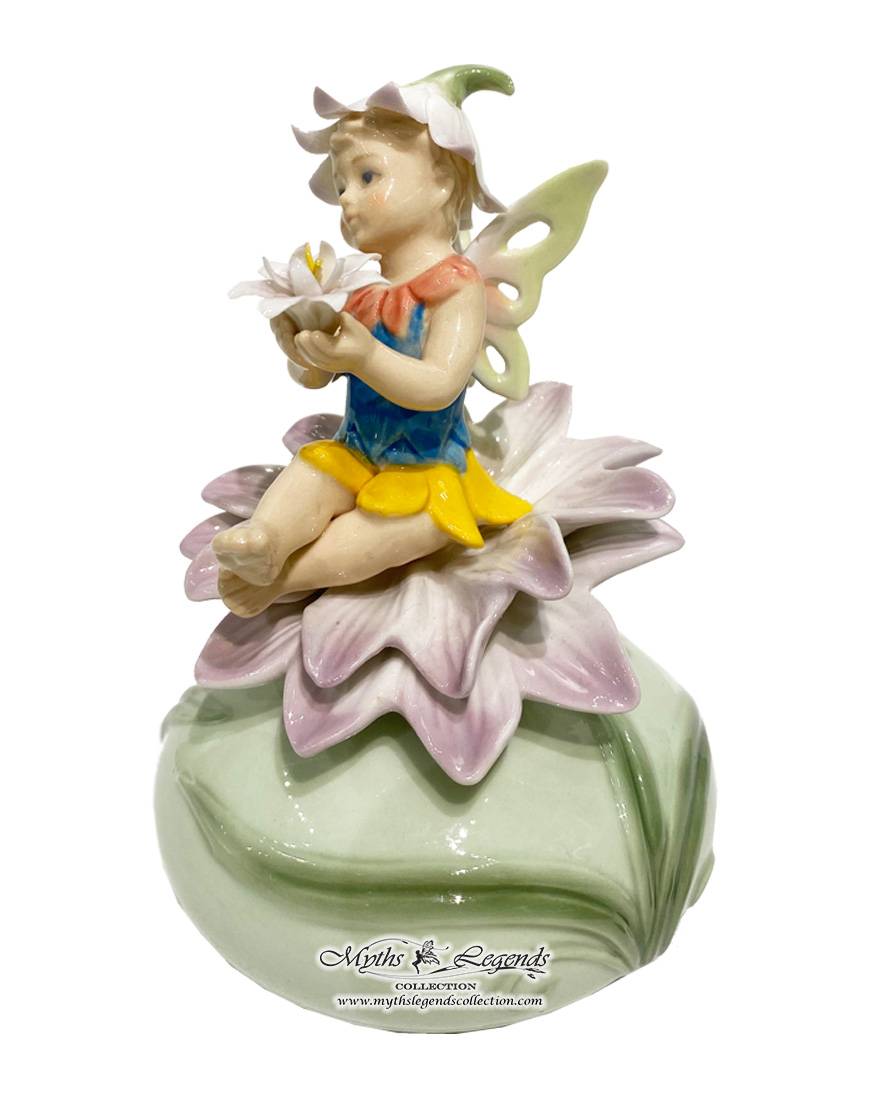In Europe, newly born children are quite often portrayed with flower blossoms to signify new life and a new beginning, thus forming the inspiration behind this particular sculpture.  A cute little baby fairy is pictured sitting comfortably on a newly blossomed flower. She holds a delicate flower in her hands and wears another flower as a hat to protect against the spring sun. This is a perfect gift for a baby shower or to celebrate a new addition to the family.