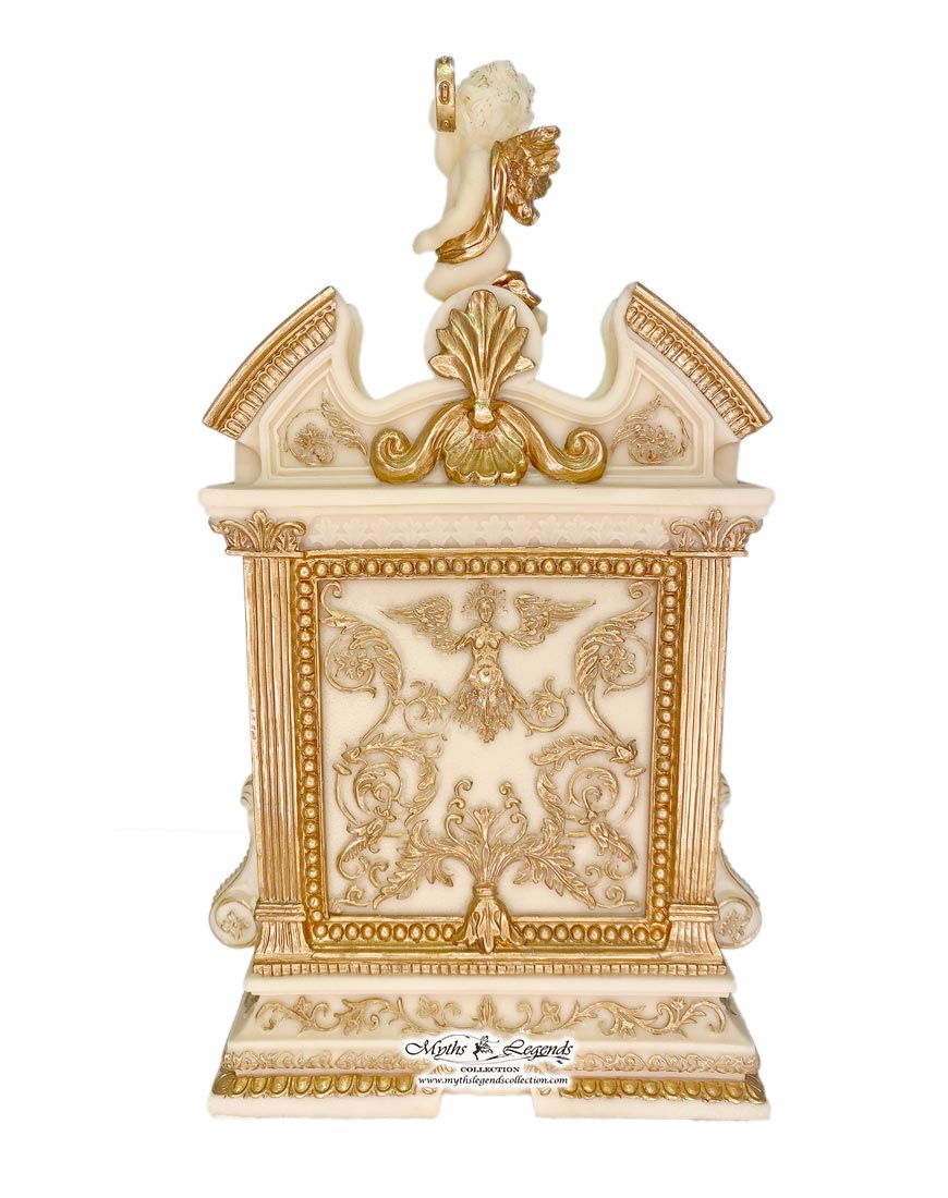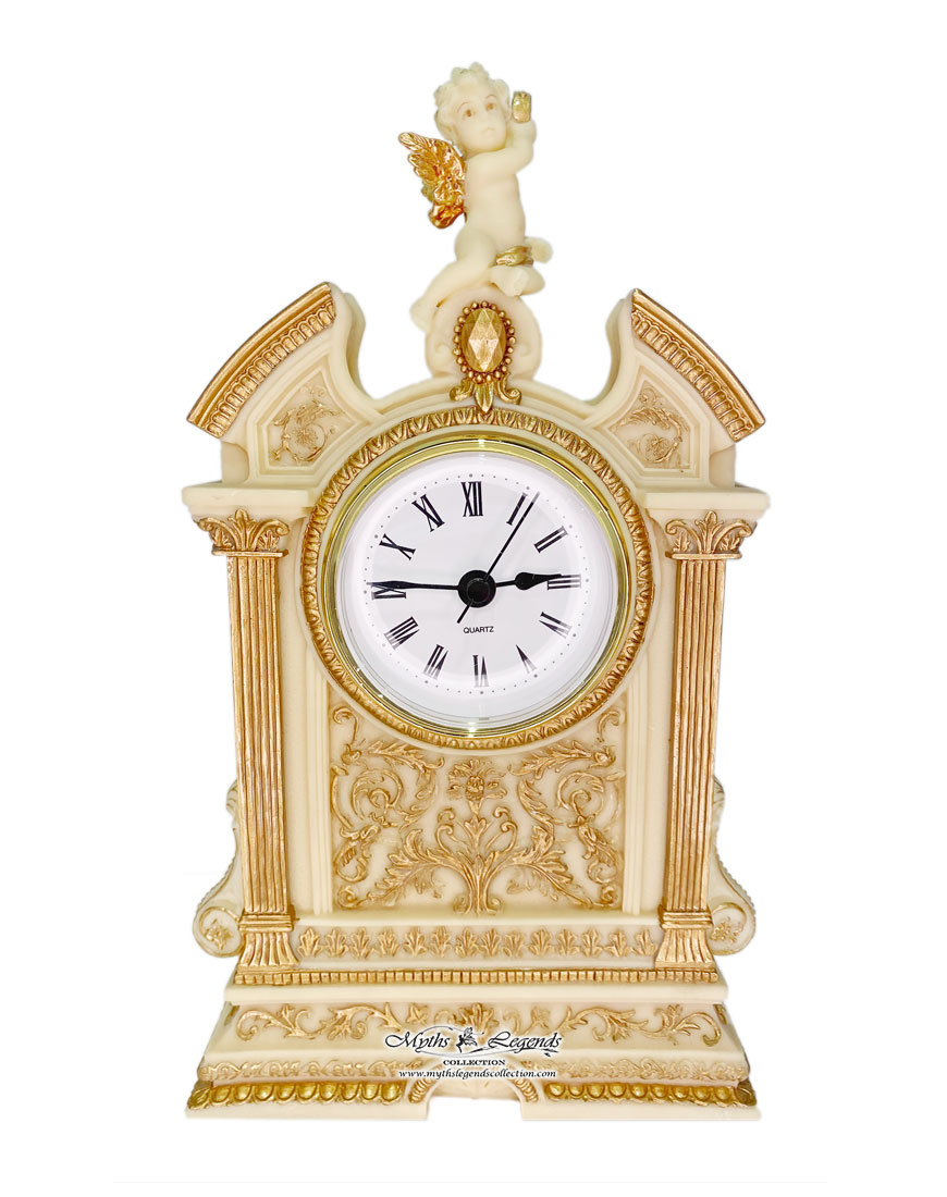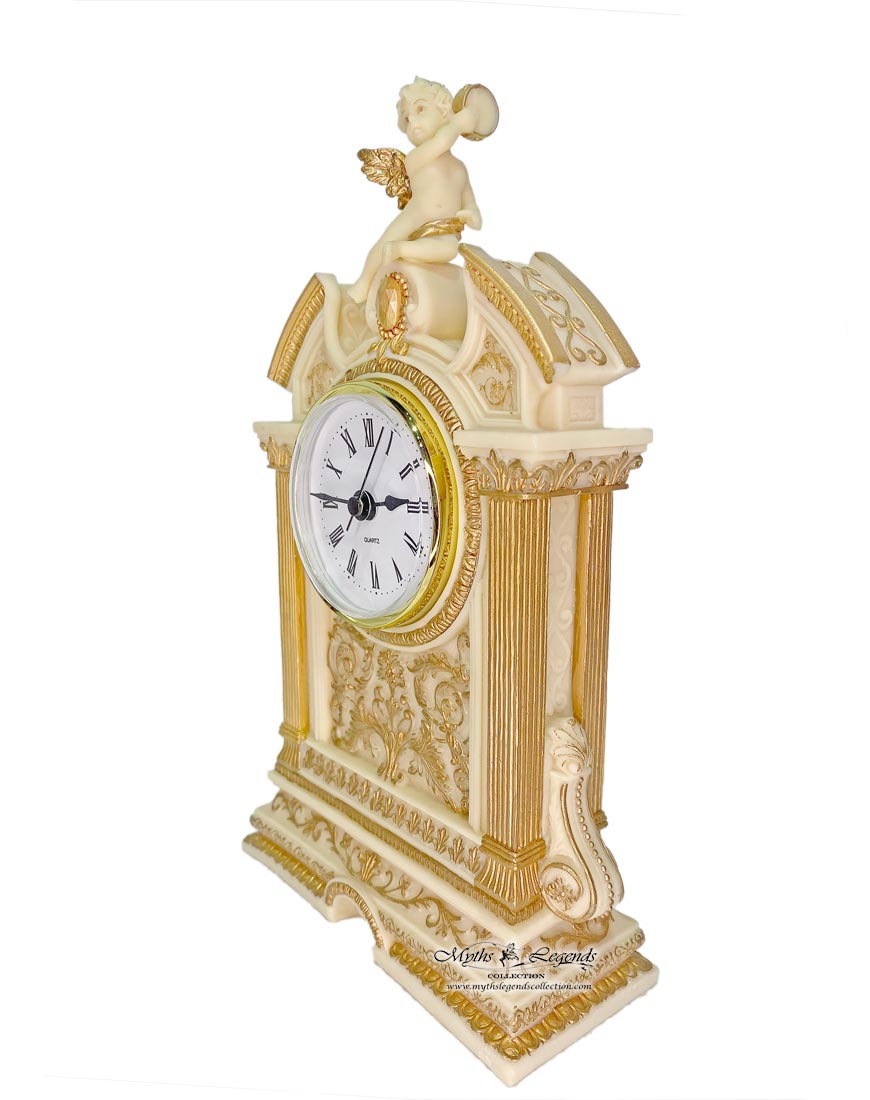 In Christianity, Cherubs are believed to be the angelic beings that tended directly to God. This is a sculpture of a Baroque tower clock with an angelic Cherub playing a harp. Baroque is an elegant style of European architecture, music, and art dating back to the 17th century. This clock can serve as a functional sculpture that beautifies your living or work space.