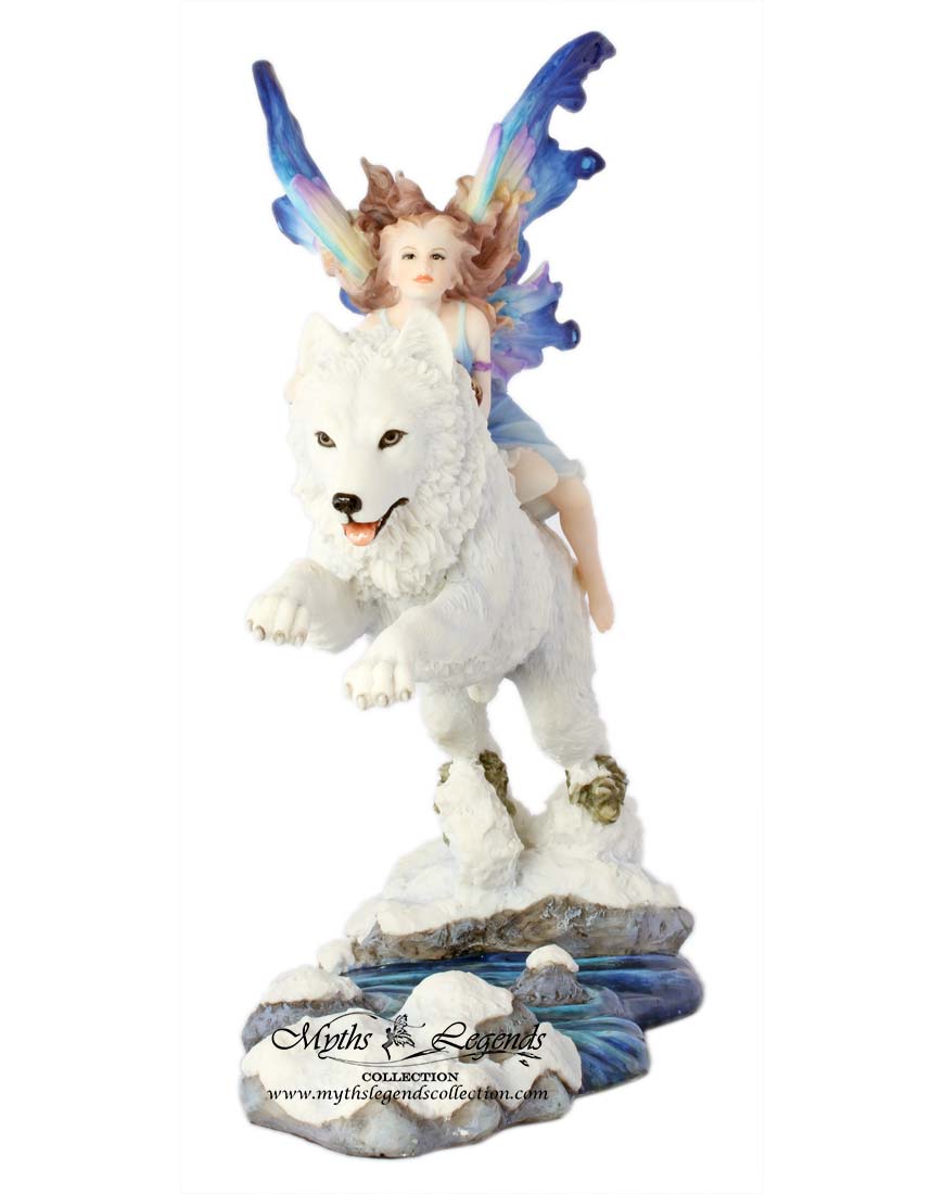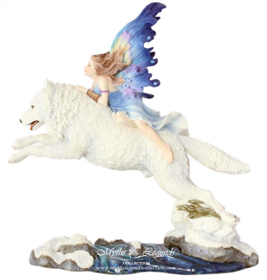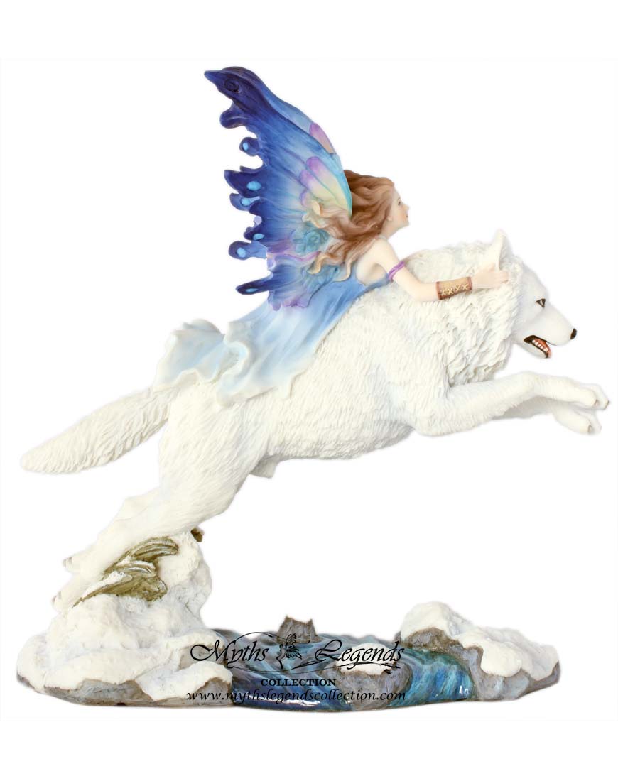 Winter is a wonderful season where the whole world is transformed as nature gets ready for another spring. There are those who are lucky enough are able to explore this wonderful season freely and in good company. This is a delightful sculpture of a fairy riding a white winter wolf. The wolf and the fairy are both longtime companions and have explored much of the natural world together.