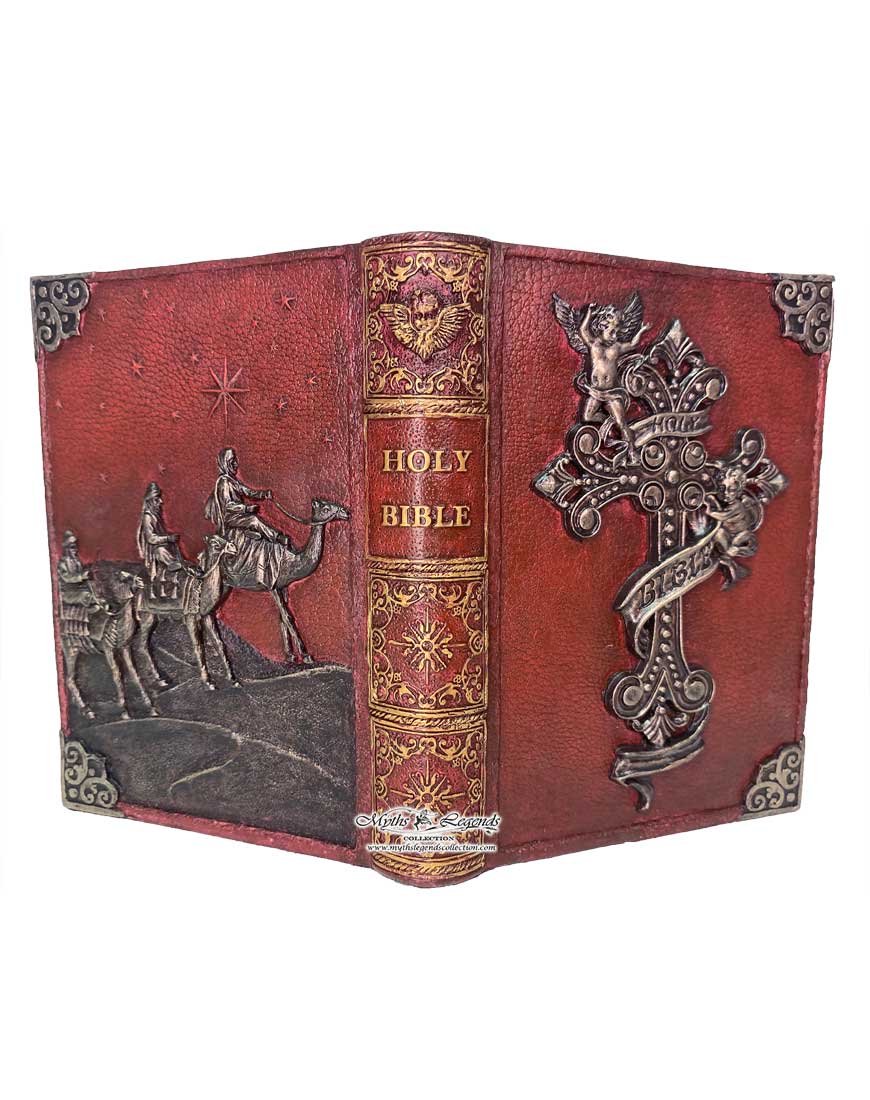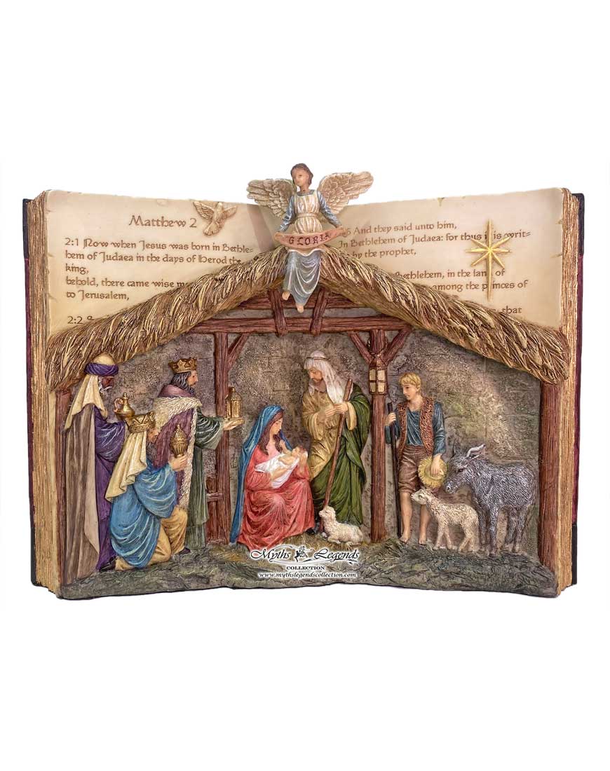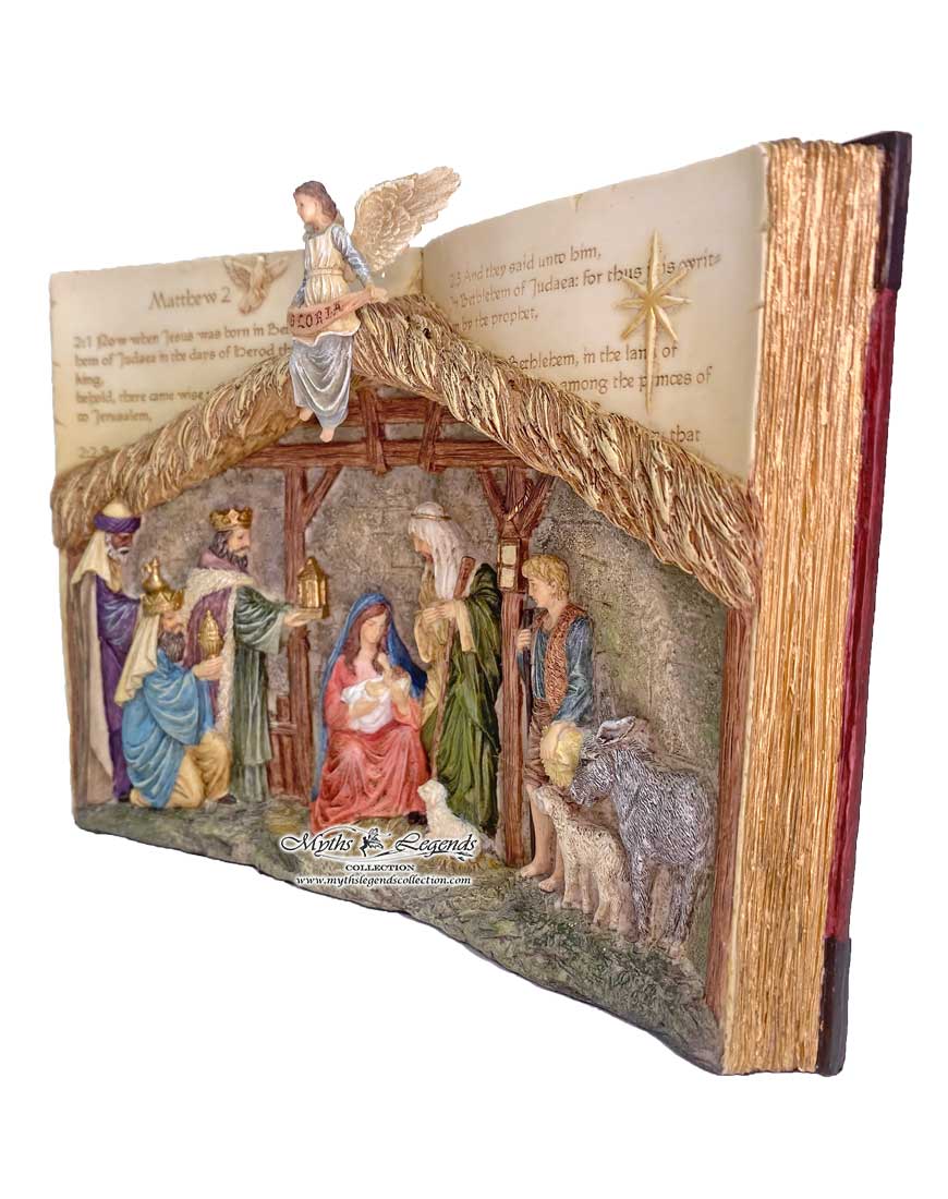 This special work of art is decorated beautifully and is exceedingly detailed with the artists depicting this Nativity scene as if it was literally coming to life from the pages of the Bible. If you turn the sculpture around, you will see the love and care down in the detail of the Bible’s cover.