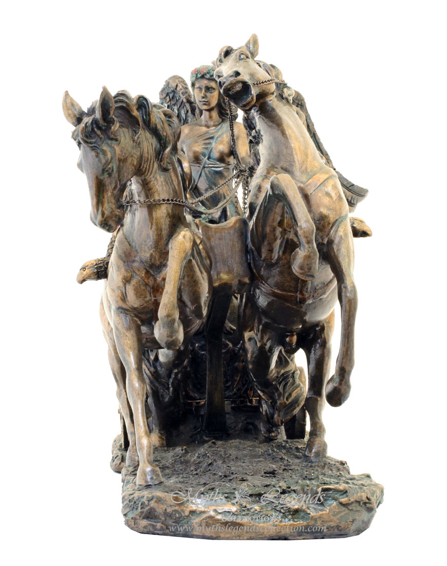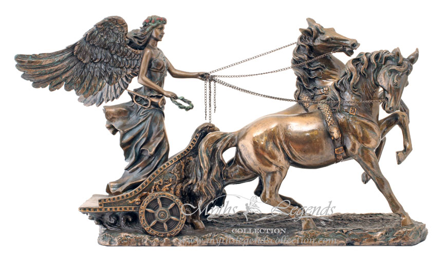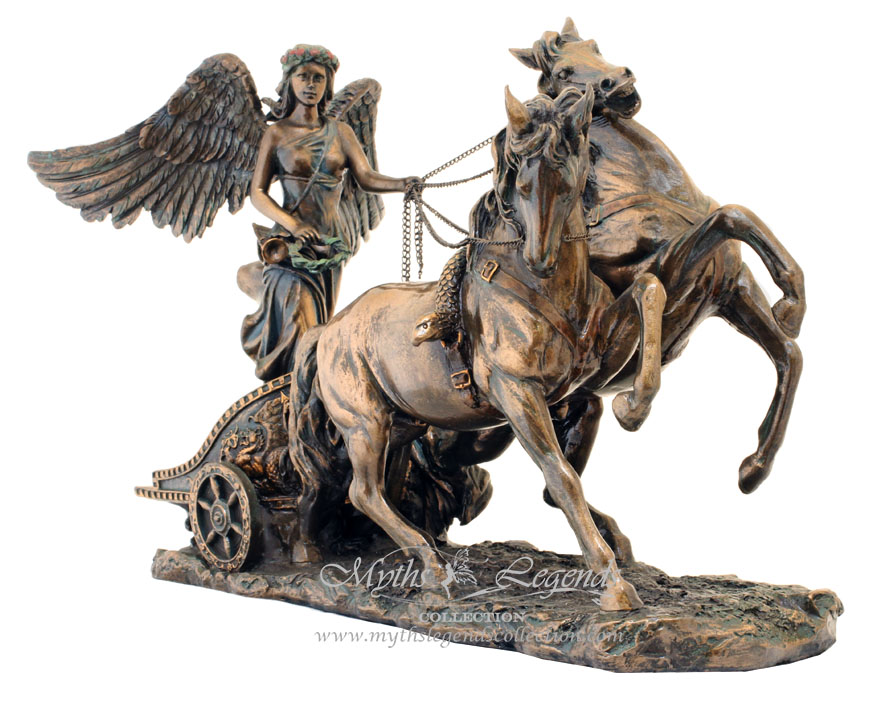 勝利女神Nike的形像是長著一對翅膀,身材健美,像從天徜徉而下,衣袂飄然。她所到之處勝利也緊跟到來。這款勝利女神馬車中,我們可以感悟到女神英勇、飄逸的氣勢。兩支張開的翅膀和輕盈飛揚的衣裙,讓人感到女神在空中騰飛,有著一種強烈的運動感。豐滿軀體在薄衫下透露出力量和健康,表現了勝利和與之而來的喜悅。所有奧運會的獎牌正面都採用此勝利女神的造型。