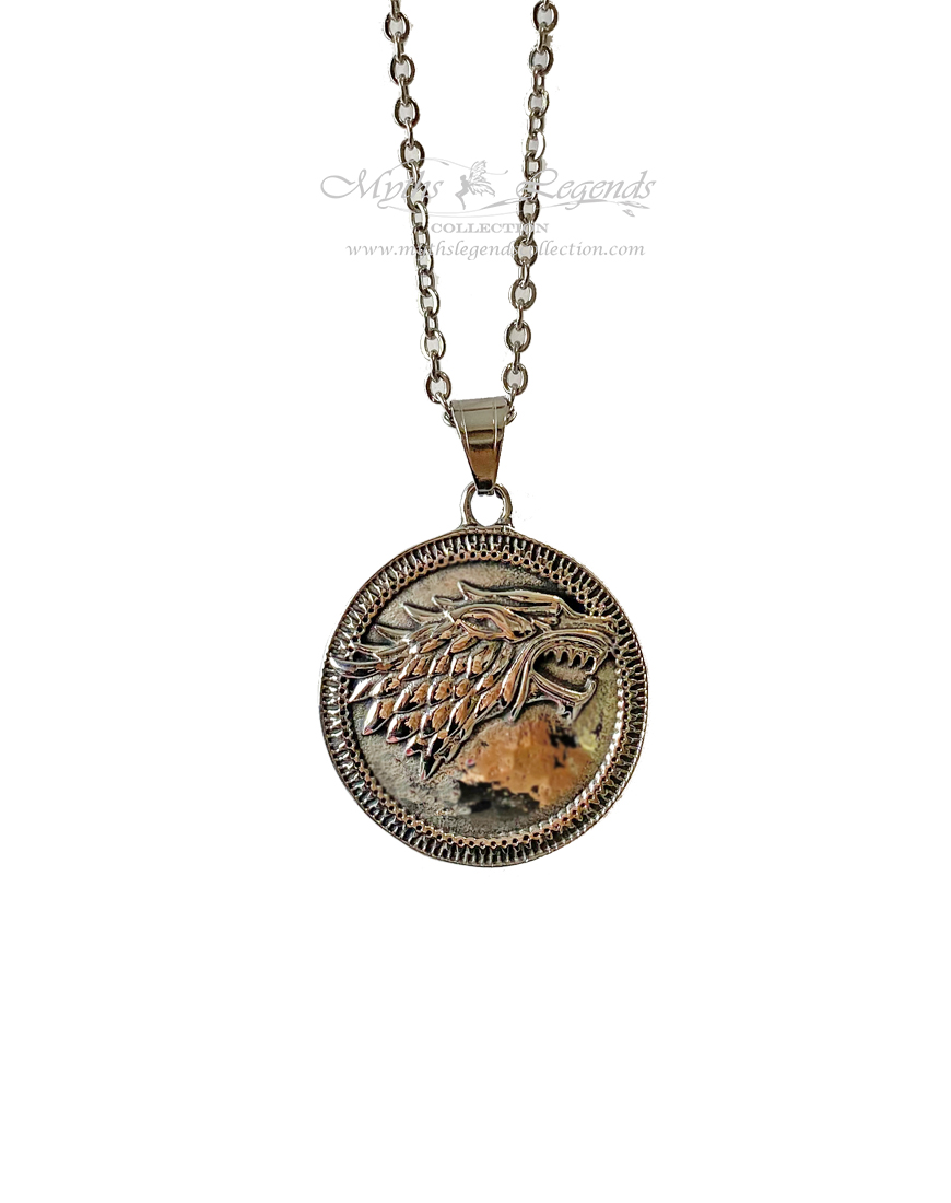 This is a wearable stainless steel jewellery piece shaped in the form of a Nordic Wolf motif in the shape of a circular medallion.