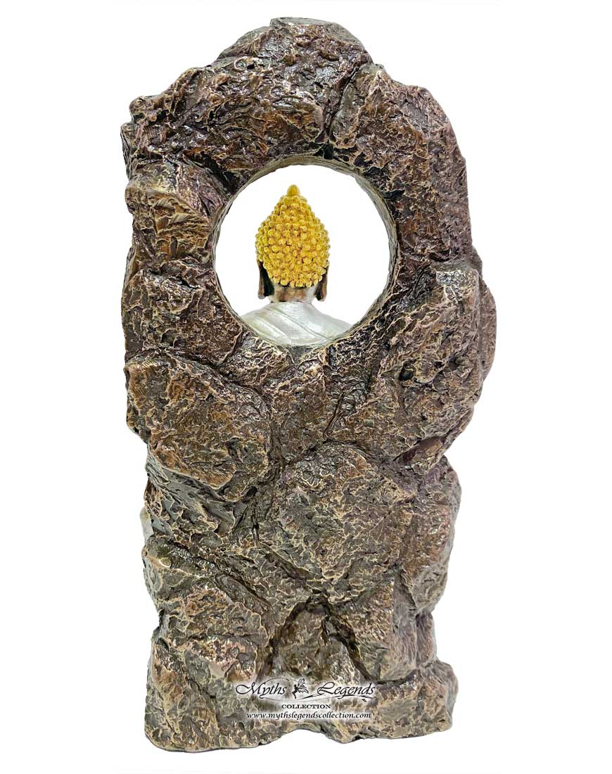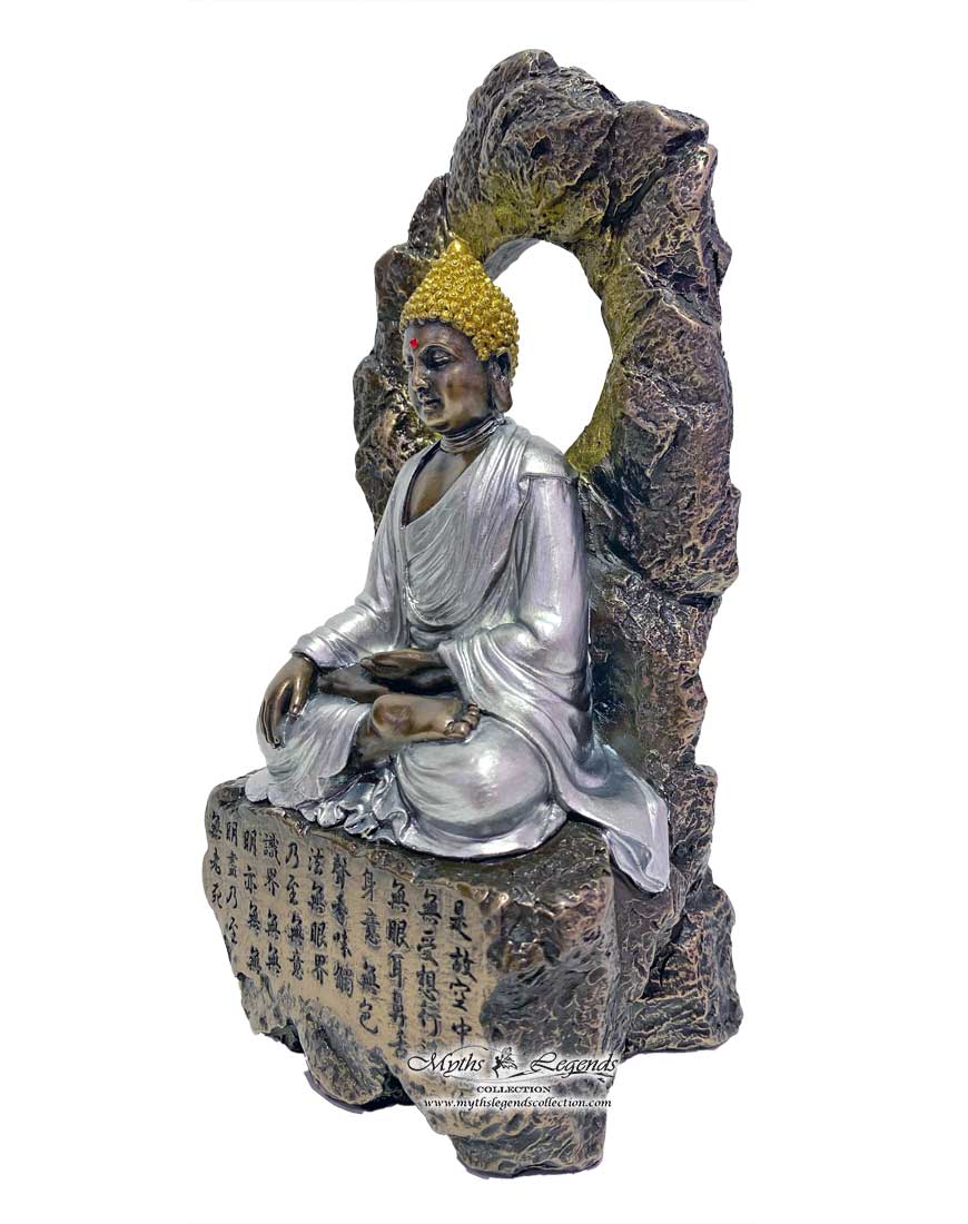 Here, Shakyamuni Buddha is portrayed in the “Earth Touching Pose” with his right arm resting on the right thigh with the fingers pointing downwards, and his left hand resting upwards, the pose that Shakyamuni Buddha used right before his enlightenment where a demon tried to trick him into moving. The Buddha’s eyes are almost closed in meditation. He is sitting on a rock with key excerpts of the Heart Sutra.