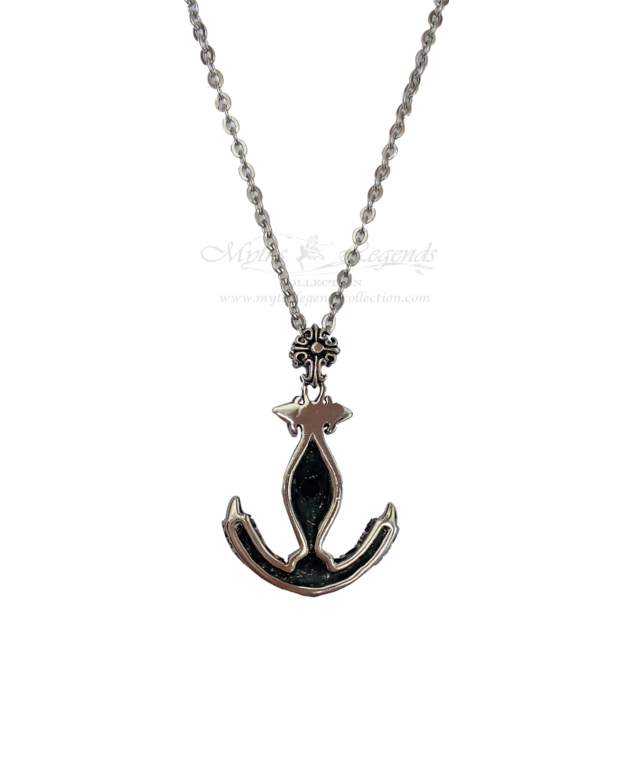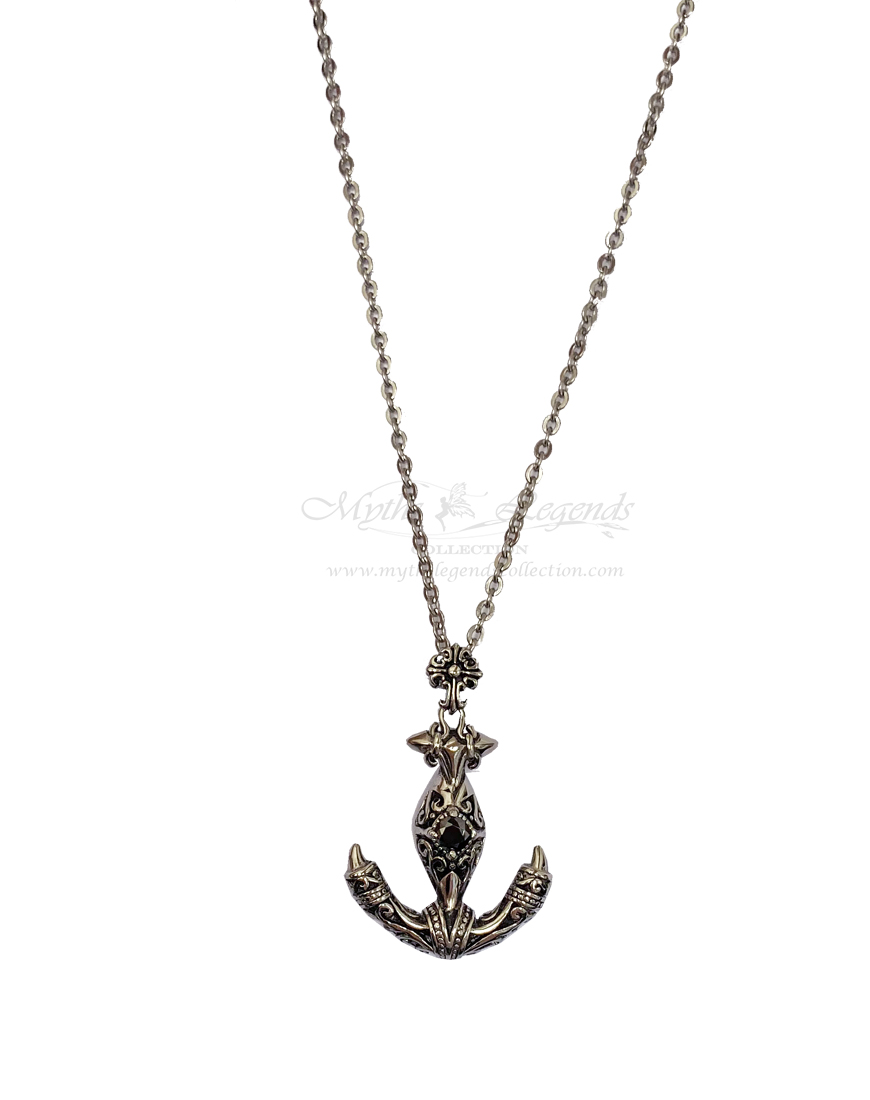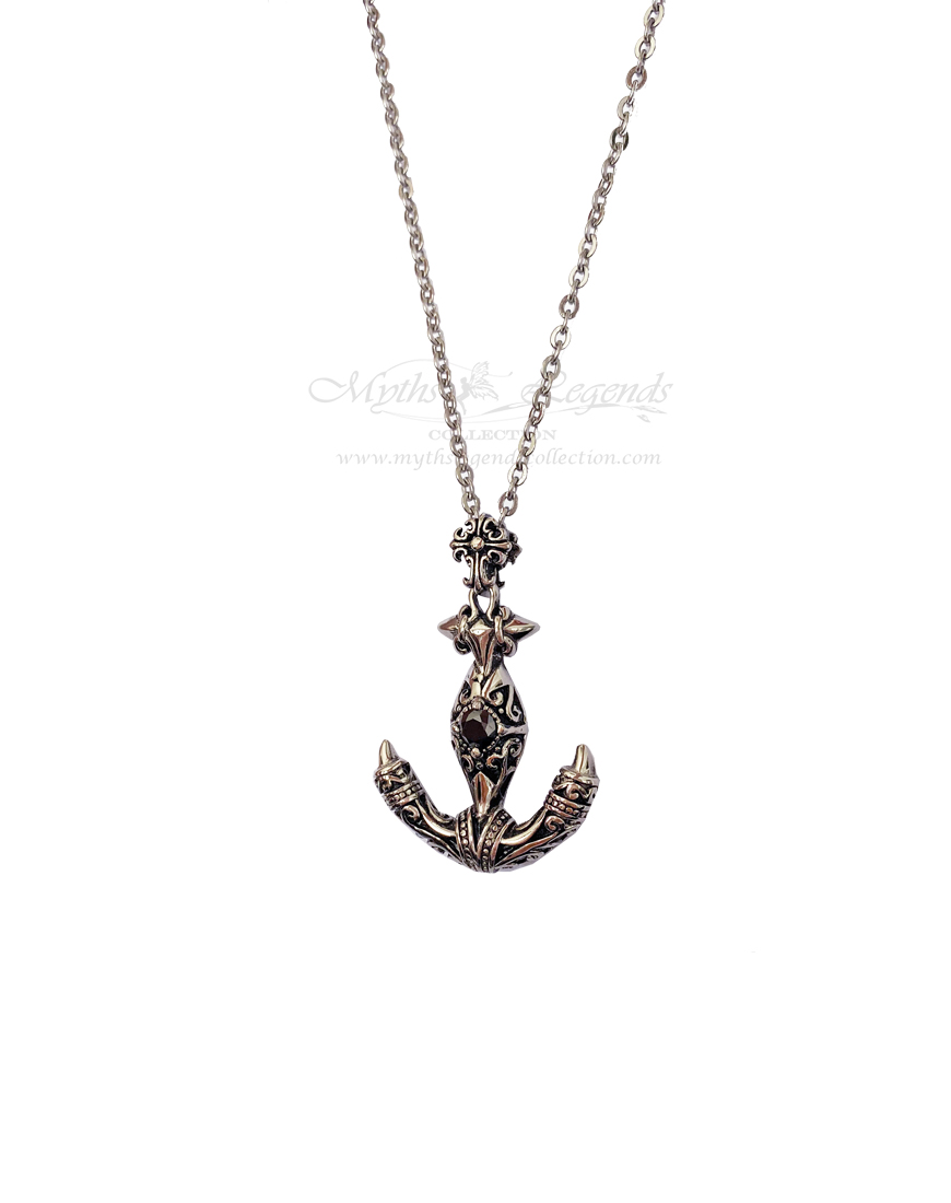 This is a wearable stainless steel jewellery piece shaped as an anchor. It has a black crystal in its centre, representing the heart. The anchor itself is quite detailed and is decorated with a cool tribal design.