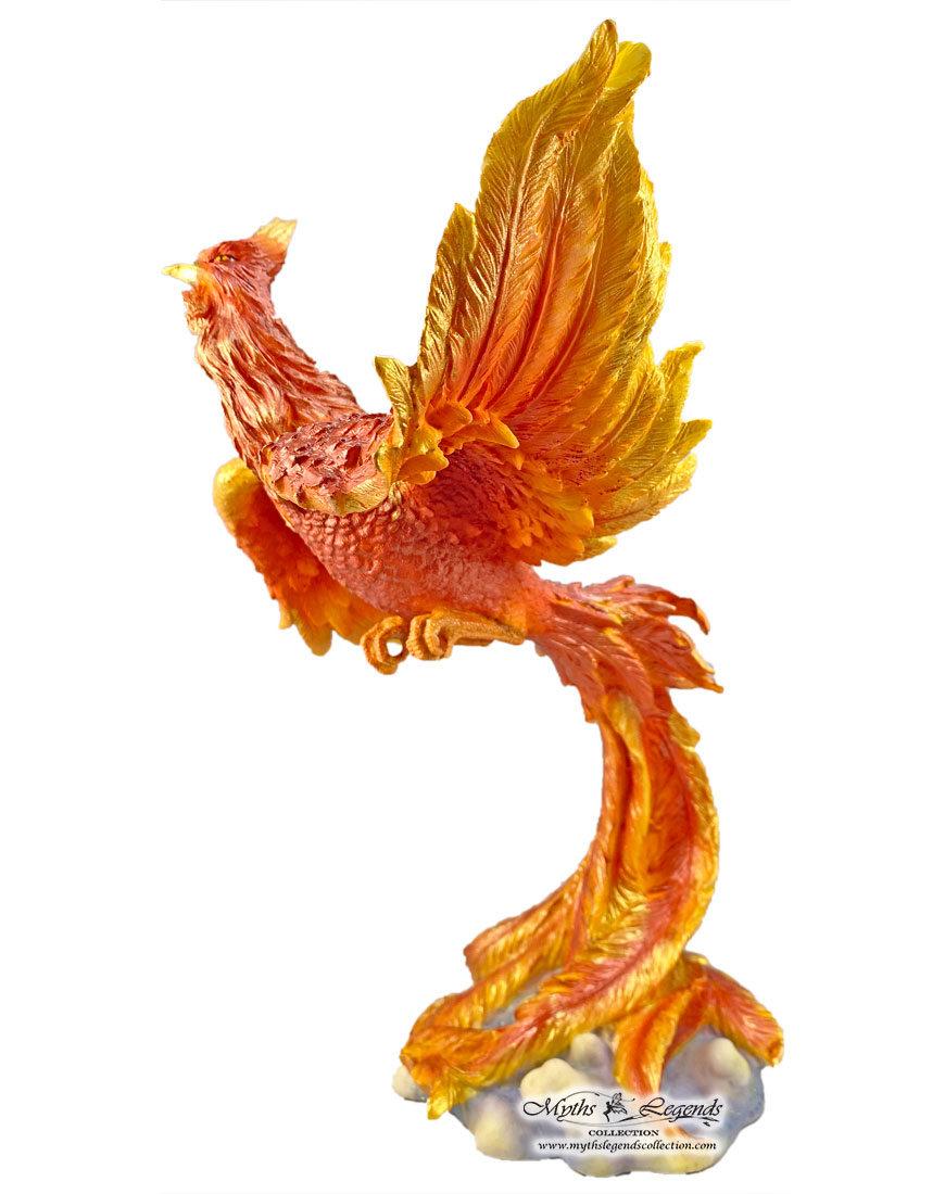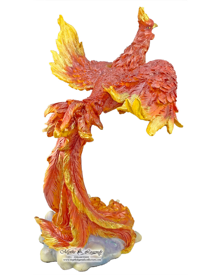 This is a sculpture of the Phoenix, soaring through the sky in all of its splendour. Its feathers are ablaze with the flames of its power, in a cycle of never-ending rise and eternal renewal. This Phoenix is elegantly portrayed with each feather detailed and hand-painted as if alive.